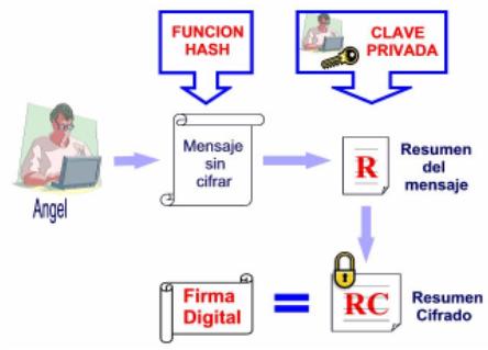 2º.- El emisor (Angel) aplica a ese mensaje electrónico una función hash (algoritmo), mediante la cual obtiene un resumen de ese mensaje.